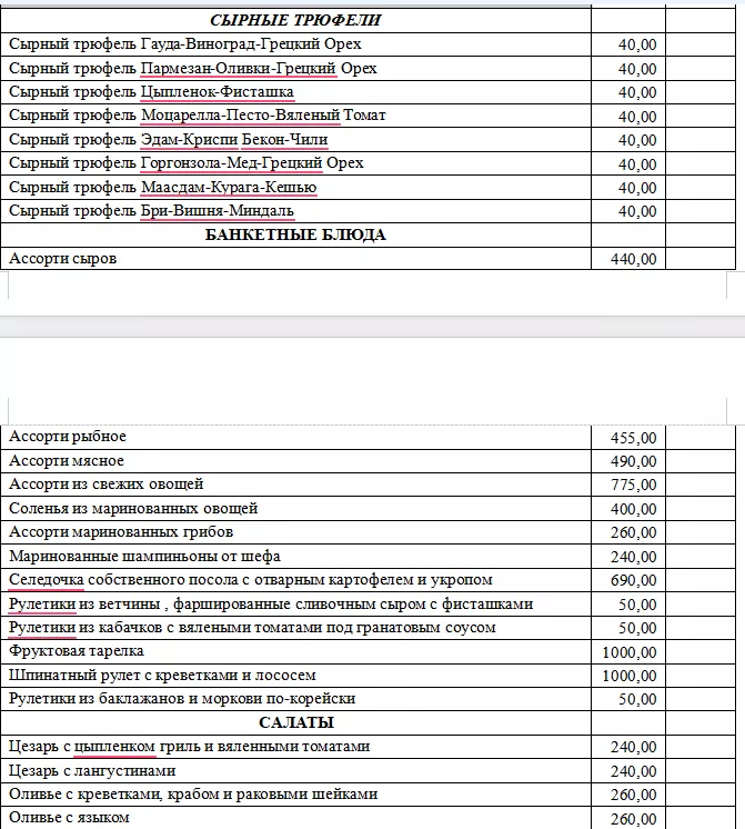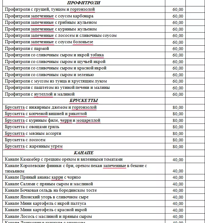 Меню включает разнообразные холодные и горячие закуски. Среди них — тарталетки с икрой и гуакамоле, профитроли с лососем и утиной печенью, сырные трюфели с орехами и медом. Для гостей приготовят ассорти из сыров, рыбы и мяса, салаты "Цезарь" и "Оливье" в нескольких вариантах, горячие блюда из свинины, курицы и рыбы.