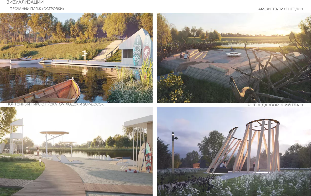 Центральными элементами новой зоны отдыха станут необычные архитектурные объекты. Ротонда «Вороний глаз» и амфитеатр «Гнездо» будут выполнены из качественных материалов с использованием термососны и стальных конструкций с антикоррозийным покрытием. Амфитеатр, выполненный в виде ступеней с деревянным настилом, станет местом для проведения культурных мероприятий и отдыха горожан.