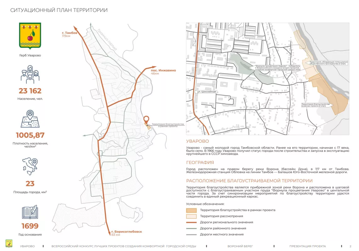 В Уварово Тамбовской области началась реализация масштабного проекта по благоустройству прибрежной территории реки Вороны. Проект под названием «Вороний берег» предусматривает создание современной зоны отдыха площадью почти 10 гектаров в самом центре города. На работы выделили почти 345 млн рублей.