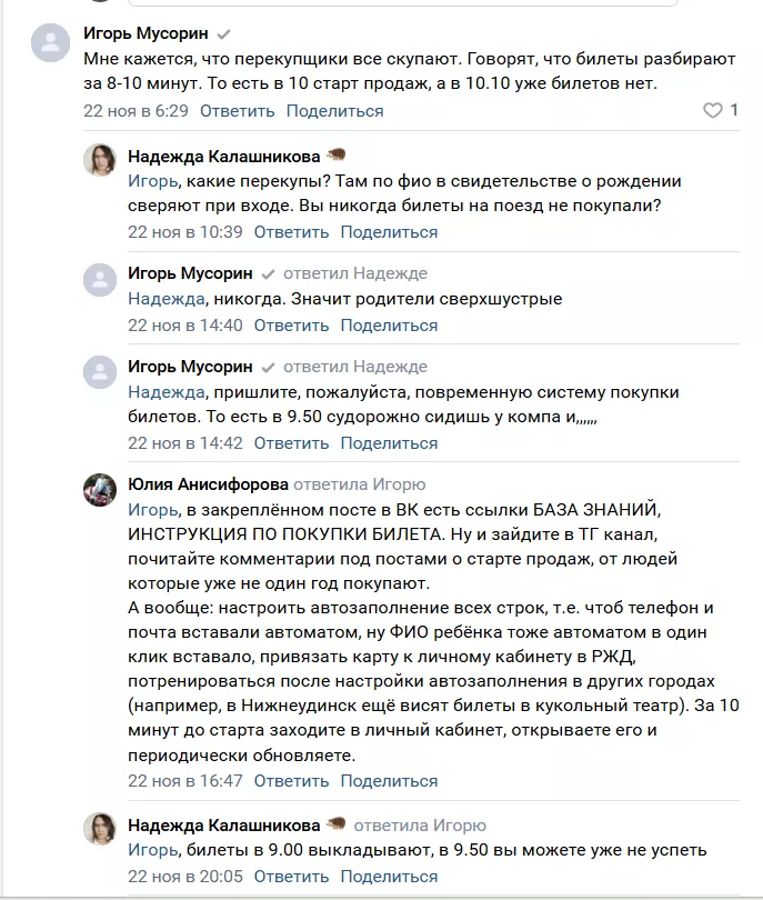 Эта история вызвала активное обсуждение среди других пользователей. Многие поддержали женщину, отметив, что сами сталкивались с подобными проблемами при покупке билетов на популярные рейсы. Некоторые предположили, что билеты могут выкупаться заранее через специальные системы или посредников. Другие выразили недоумение, почему при столь высоком спросе не увеличивается количество поездов или вагонов.
