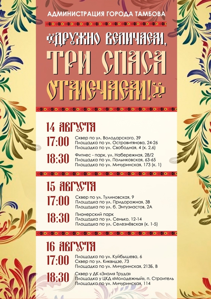 В Тамбове в середине августа состоится серия праздничных мероприятий, приуроченных к трём православным праздникам — Медовому, Яблочному и Ореховому Спасам. Жителей и гостей города ждут концерты, творческие программы и угощения на 18 площадках областного центра.