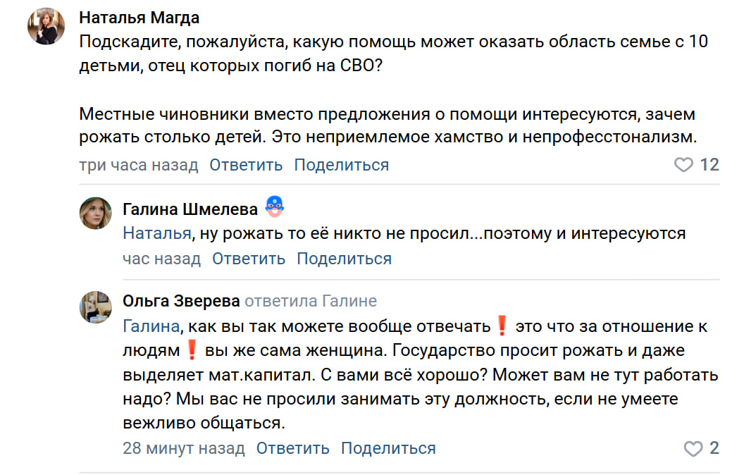 «Господин губернатор, в области произошел вопиющий случай: мать 10 детей, Кузьмина Наталья Владимировна, попросила у чиновников помощи в связи с гибелью мужа на СВО, вместо помощи получила насмешки. Помогите разобраться в ситуации».