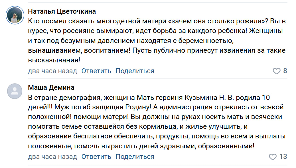 «Кто посмел сказать многодетной матери: «Зачем она столько рожала»? Вы в курсе, что россияне вымирают, идет борьба за каждого ребенка! В стране демография, женщина Мать-героиня Кузьмина Н. В. родила 10 детей!!! Муж погиб, защищая Родину! А администрация отреклась от всякой положенной помощи матери!»
