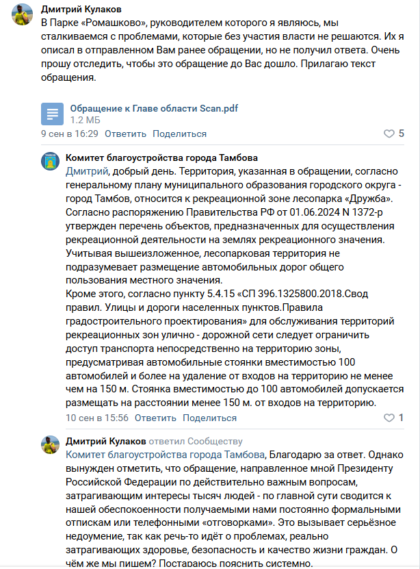 Руководитель тамбовского парка «Ромашково» Дмитрий Кулаков написал письмо президенту России Владимиру Путину. В нем он рассказал, как его попытки решить серьезные проблемы с инфраструктурой разбиваются о стену чиновничьего равнодушия и формализма. Поводом для отчаяния стал ответ на его же обращение к президенту во время «прямой линии».
