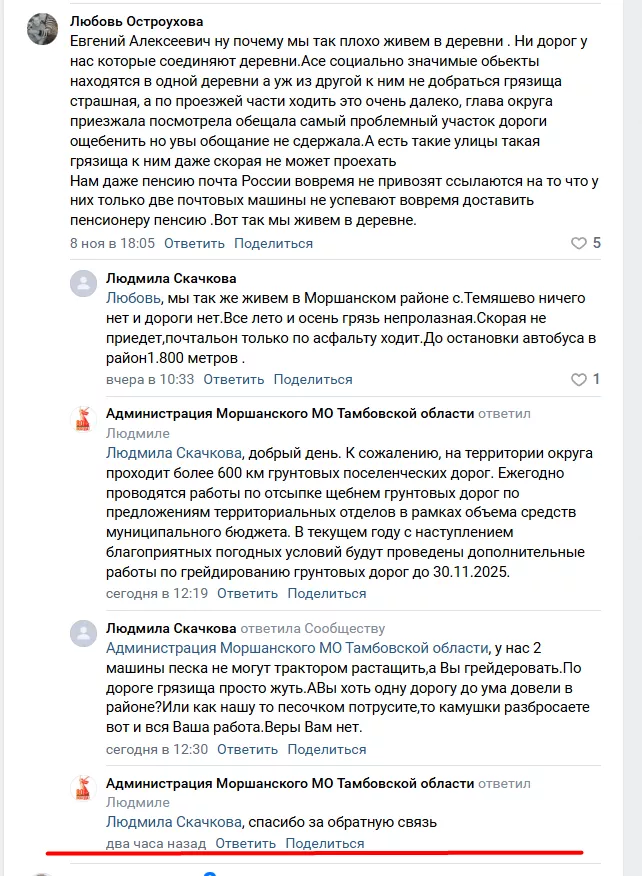 «У нас 2 машины песка не могут трактором растащить, а Вы грейдеровать. По дороге грязища просто жуть. А Вы хоть одну дорогу до ума довели в районе? Или как нашу: то песочком потрусите, то камушки разбросаете — вот и вся Ваша работа. Веры Вам нет».