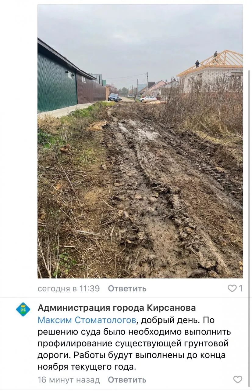 Администрация города Кирсанова ответила, что по решению суда необходимо было провести профилирование существующей грунтовой дороги. Чиновники пообещали выполнить эти работы до конца ноября. Но у жителя возникли вопросы: