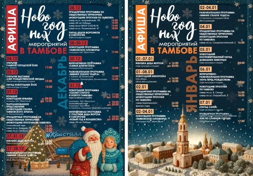 Основной пик празднования придётся на 31 декабря. В этот день новогодние события будут проходить в разных районах Тамбова до 20:00. Активная культурная программа продолжится и в период январских каникул — для горожан и гостей города подготовлены концерты, игровые и семейные мероприятия. Подробные афиши размещены на официальных ресурсах города.