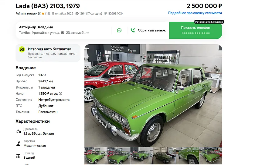 Вслед за уникальным кабриолетом Lada «Наташа» в Тамбове на продажу выставили ещё один раритет. На этот раз речь идёт о классическом автомобиле ВАЗ-2103, более известном как «трёшка». За модель 1979 года выпуска местный автоцентр просит 2,5 миллиона рублей.