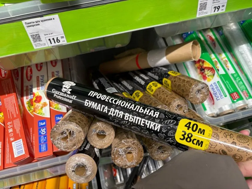 Первым делом нашла профессиональную бумагу для выпечки. Готовить я люблю, поэтому рулоны сразу покупаю побольше. В магазине можно взять отличный вариант - выглядит внушительно.