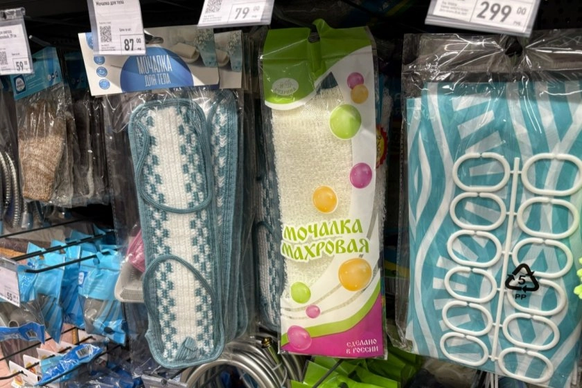 Также на глаза попались мочалки. Есть разные варианты материалов и цен. Дороже 100 рублей не нашла - отличный повод, чтобы обновить мочалки у всей семьи.