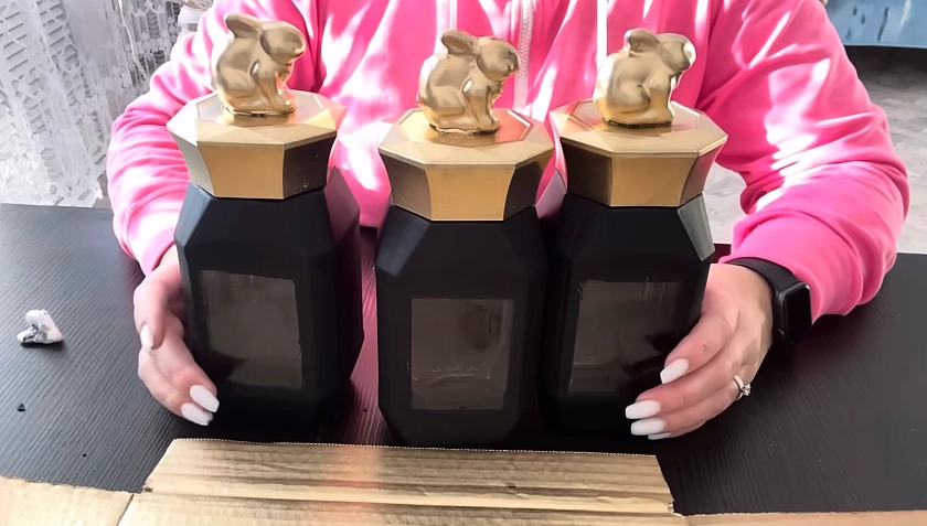 Дальше начинается самое эффектное. Крышки с фигурками окрашивают золотистой универсальной краской, а сами банки покрывают чёрной матовой краской. Лучше делать это на улице или в хорошо проветриваемом месте, потому что запах у аэрозольной краски обычно довольно бодрый.